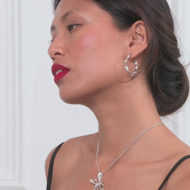 The Splash Wave Hoops are a distinctive and modern take on the classic hoop earring. Designed with a wave-like structure, these earrings evoke the beauty of flowing water, making them an eye-catching addition to any jewellery collection. Crafted from high-quality 925 Sterling Silver with a rhodium overlay, they combine elegance with a playful twist, perfect for both everyday wear and special occasions.