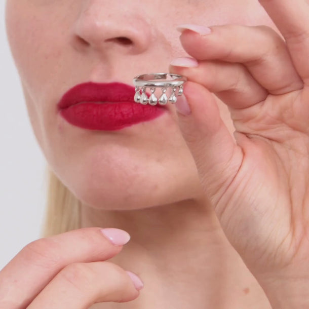 This stylish and quirky ring features six dainty tear drops that elegantly dangle from the shank, adding a unique and eye-catching element to your look.