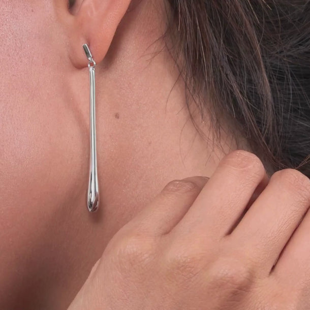 These elegant drop earrings are designed with a sleek, linear shape that makes a bold yet graceful statement. Their elongated length beautifully frames the face, adding sophistication to any look.